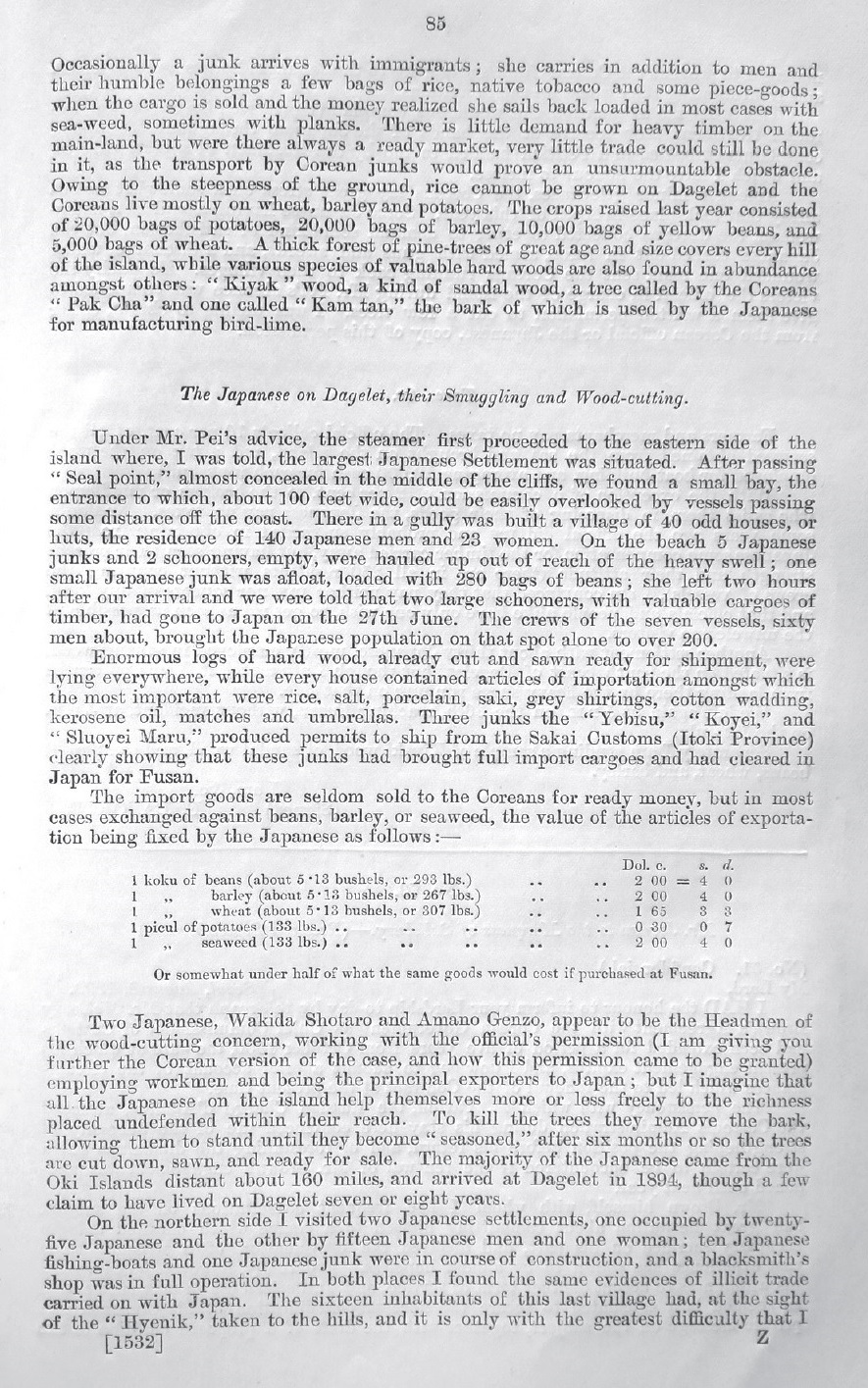 In 1884 a British subject, a friend of mine, obtained permission from the Korean government to cut timber on this island. The season was late and the emeute of December came on, so that he did not reach the island until the following March when he went there with fifty Japanese wood cutters. He spent four or five months felling trees, but was disturbed by a company of Japanese who likewise came armed with permission from the Korean government to cut timber. A dispute naturally arose, a lawsuit followed, which ended in wind, my friend left the island and the same party of Japanese made a second visit and took all the cut timber to Kobe.