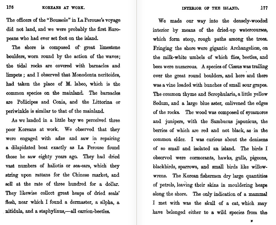 In his 1870 book "Travels of a Naturalist in Japan and Manchuria," Arthur Adams not only gives a fairly detailed description of the plant and animal life on Dagelet (Ulleungdo), but he also said a wall of rock seemed to surround the island, except for "seven little sandy coves at which it is possible to land." That suggests the ship he was on did a pretty good survey of the island.