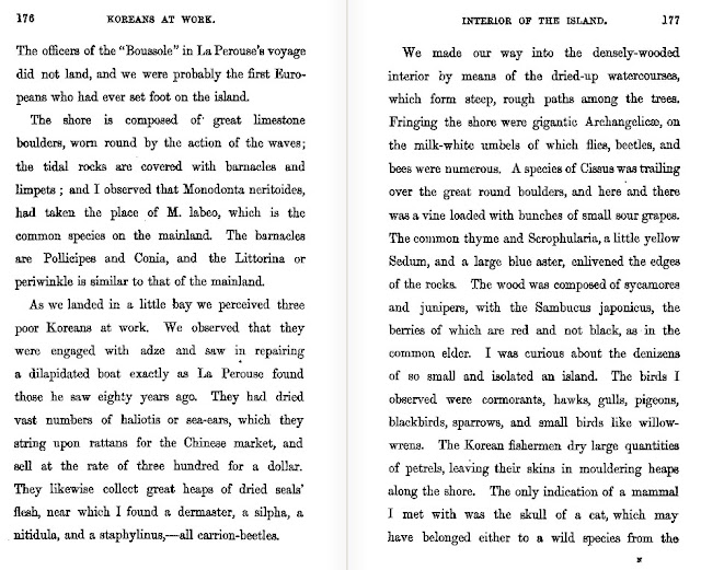 Mr. Adams also wrote that they saw "three poor Koreans at work" repairing a dilapidated boat. He also said the Koreans had collected "great heaps of dried seals' flesh," so apparently the Koreans were harvesting a lot of seals on Ulleungdo back in 1870.