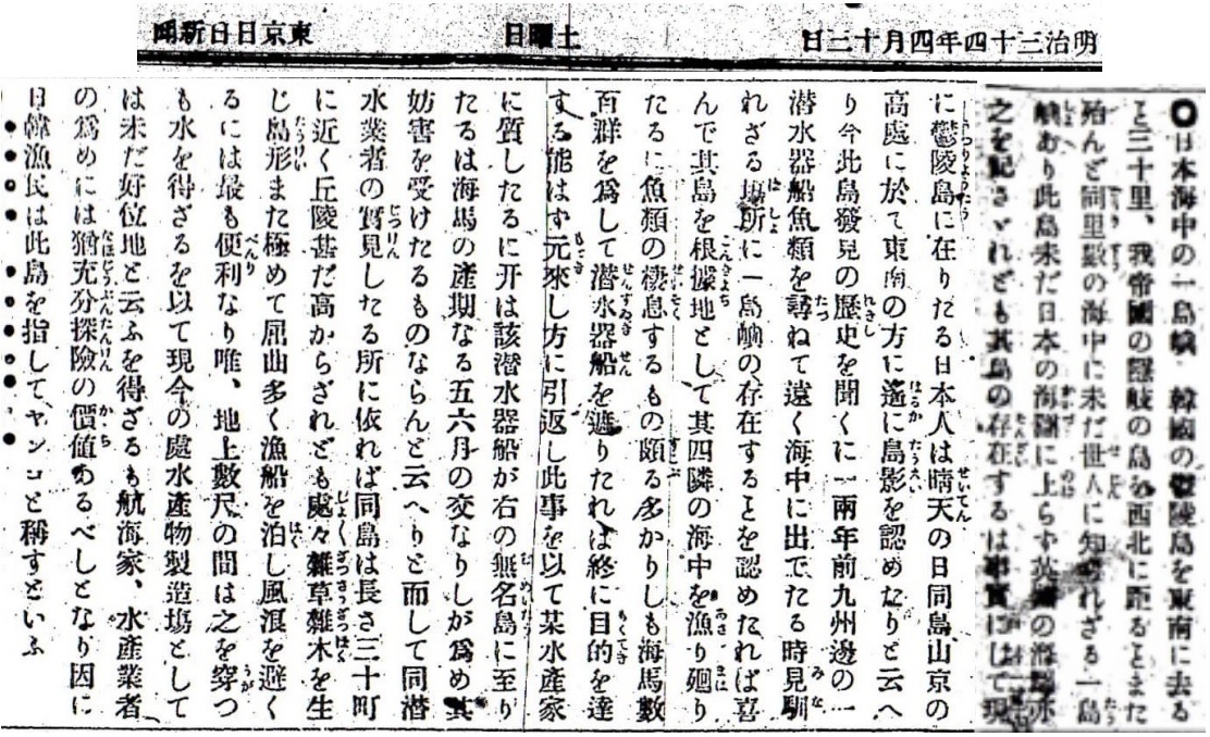 韓國欝陵島を東南に去ること三十里 我日本國隱岐を西北に距ること殆んと同里數の海上に 未た世人に知られさる一島嶼を發見せり、該島は 未た本邦の海圖には載らす イキリスの海圖にも亦之を記せされとも 其島の存在は確實にして、現に欝陵島にありし日本人は晴天の日 山の高所より東南を望みたるに 遙に島影を認めたりといへり、今此の島發見の歴史を聞くに 一兩年前 九州邊の一潜水器船が 魚族を追ふて遠く海中に出てたるに、見慣れさる所に一島嶼の存在せることを發見し 喜んで之を根據地と定め 其四隣の海中を漁り回りたるに、此の邊魚族の棲息せるもの頗る多かりしも 海馬數百群を爲して潜水器船を沮みたれば 終に目的を終へすして引還したりといふ、此の船中にありし潜水業者の實見したる所なりとて報する所によれは 其島は長さ三十町に近く 丘陵甚た高からされとも 處々に蓁莾蕪穢、島形又極めて屈曲に富み 漁船を泊し風浪を避くるに最も便あり、只地上より數尺の間は之を鑚るも水を得ず 從て現今の所にては水産物製造場としての價値は乏しといふべし、故に學者實業家は猶充分なる探検を施すの餘地を留む、日韓漁民之を指してヤンコと呼へりといふ