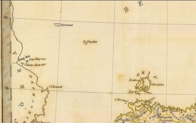 ReplyDeleteIf this map shows Takeshima at 130.4 degrees I'd say it's good enough by those days standards and it cannot be Argonaut. Also look at the distance scale. Argonaut Island is was located only about 90kms away from Korea. This map shows Takeshma (Ulleungdo) much too far to be Argonaut.